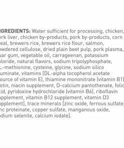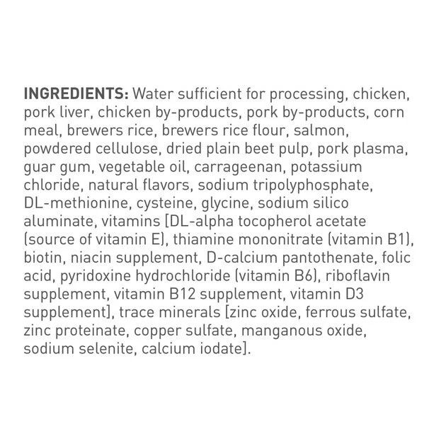 Water Sufficient for Processing, Chicken, Pork Liver, Chicken By-Products, Pork By-Products, Corn Meal, Brewers Rice, Brewers Rice Flour, Salmon, Powdered Cellulose, Dried Plain Beet Pulp, Pork Plasma, Guar Gum, Vegetable Oil, Carrageenan, Potassium Chloride, Natural Flavors, Sodium Tripolyphosphate, Dl-Methionine, Cysteine, Glycine, Sodium Silico Aluminate, Vitamins [Dl-Alpha Tocopherol Acetate (Source of Vitamin E), Thiamine Mononitrate (Vitamin B1), Biotin, Niacin Supplement, D-Calcium Pantothenate, Folic Acid, Pyridoxine Hydrochloride (Vitamin B6), Riboflavin Supplement, Vitamin B12 Supplement, Vitamin D3 Supplement], Trace Minerals [Zinc Oxide, Ferrous Sulfate, Zinc Proteinate, Copper Sulfate, Manganous Oxide, Sodium Selenite, Calcium Iodate].