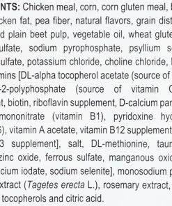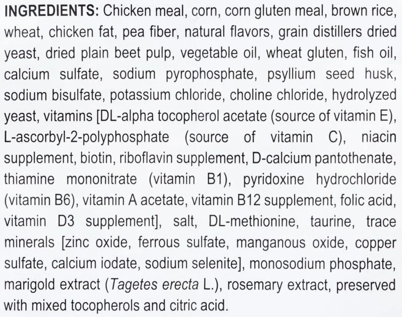 Chicken Meal, Corn, Corn Gluten Meal, Brown Rice, Wheat, Chicken Fat, Pea Fiber, Natural Flavors, Grain Distillers Dried Yeast, Dried Plain Beet Pulp, Vegetable Oil, Wheat Gluten, Fish Oil, Calcium Sulfate, Sodium Pyrophosphate, Psyllium Seed Husk, Sodium Bisulfate, Potassium Chloride, Choline Chloride, Hydrolyzed Yeast, Vitamins [DL-Alpha Tocopherol Acetate (source of Vitamin E), L-Ascorbyl-2-Polyphosphate (source of Vitamin C), Niacin Supplement, Biotin, Riboflavin Supplement, D-Calcium Pantothenate, Thiamine Mononitrate (Vitamin B1), Pyridoxine Hydrochloride (Vitamin B6), Vitamin A Acetate, Vitamin B12 Supplement, Folic Acid, Vitamin D3 Supplement], Salt, DL-Methionine, Taurine, Trace Minerals [Zinc Oxide, Ferrous Sulfate, Manganous Oxide, Copper Sulfate, Calcium Iodate, Sodium Selenite], Monosodium Phosphate, Marigold Extract (Tagetes Erecta L.), Rosemary Extract, Preserved With Mixed Tocopherols and Citric Acid.
