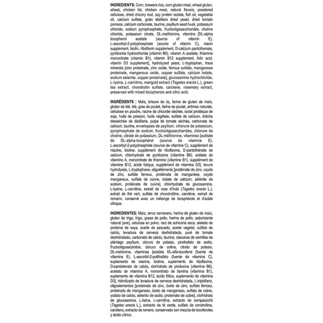 Corn, Corn Gluten Meal, Brewers Rice, Wheat Gluten, Wheat, Chicken Meal, Chicken Fat, Powdered Cellulose, Natural Flavors, Soy Protein Isolate, Chicory, Fish Oil, Vegetable Oil, Calcium Sulfate, Potassium Chloride, Psyllium Seed Husk, Calcium Carbonate, Fructooligosaccharides, Dl-Methionine, Potassium Citrate, Taurine, Hydrolyzed Yeast, Choline Chloride, L-Lysine, L-Tryptophan, Glucosamine Hydrochloride, Vitamins [Dl-Alpha Tocopherol (Source of Vitamin E), L-Ascorbyl-2-Polyphosphate (Source of Vitamin C), Niacin, Biotin, D-Calcium Pantothenate, Riboflavin (Vitamin B2), Pyridoxine Hydrochloride (Vitamin B6), Vitamin A Acetate, Sodium Pyrophosphate, Thiamine Mononitrate (Vitamin B1), Vitamin B12 Supplement, Folic Acid, Vitamin D3 Supplement], Trace Minerals (Zinc Proteinate, Zinc Oxide, Ferrous Sulfate, Manganese Proteinate, Manganous Oxide, Copper Sulfate, Calcium Iodate, Sodium Selenite, Copper Proteinate), L-Carnitine, Green Tea Extract, Lycopene, Marigold Extract (Tagetes Erecta L.), Chondroitin Sulfate, Rosemary Extract, Preserved with Natural Mixed Tocopherols and Citric Acid.