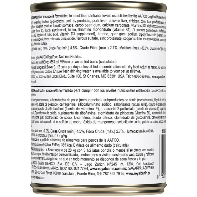 Royal Canin Breed Health Nutrition Boxer Adult Loaf in Sauce Canned Dog Food is tailor-made nutrition created just for your pure breed Boxer. Whether you have a fawn, brindle, or white purebred, this exclusive breed-specific diet is uniquely formulated for your large dog, with the specific nutrients to help large breeds thrive. The complete and balanced soft dog food features a smooth patรฉ texture to appeal to your Boxerโs appetite. Precise protein content and L-carnitine provide healthy muscle support for an ideal weight. And this Boxer dog food contains essential nutrients like taurine, EPA, and DHA to help maintain heart health. Mix in or complement this wet food with Royal Canin Boxer Dry Dog Food for a meal thatโs sure to have him licking his chops.
