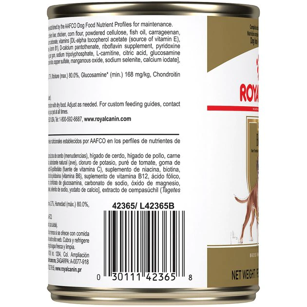 - Complete and balanced canned dog food can be fed alone or mixed with Royal Canin Adult Boxer Dry Dog Food.
