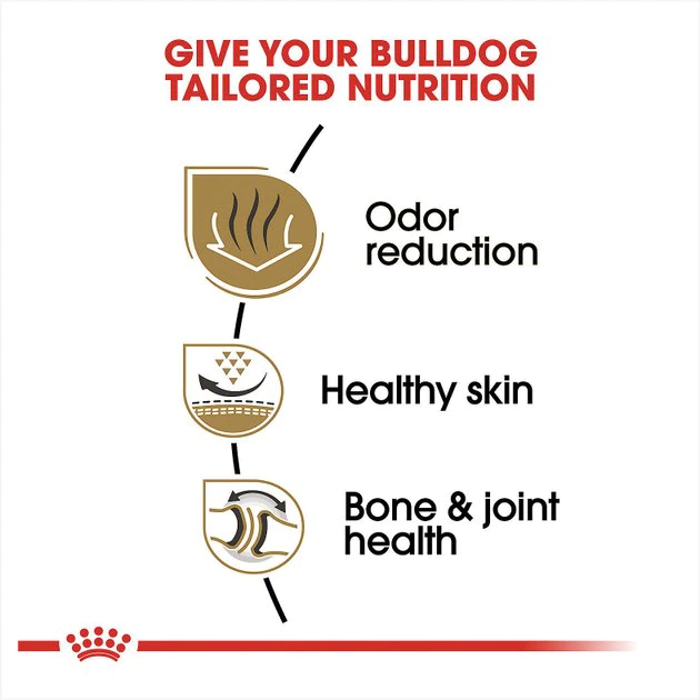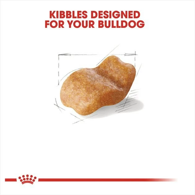 Royal Canin Breed Health Nutrition Bulldog Adult Dry Dog Food is tailor-made nutrition created just for your Bulldog pure breed. Whether you call yours an English Bulldog or British Bulldog, this exclusive breed-specific diet is uniquely formulated for your mid size dog with specific nutrients to help him thrive. The wave-shaped specialized kibble is designed for your medium breedโs unique jaw, making it easy for him to pick up and chew. Highly digestible proteins, precise fiber content, and high-quality carbohydrates support gut health to decrease gas and unpleasant odors while promoting optimal stool quality. Exclusive nutrients provide skin care and reinforce your Bulldogโs skin barrier to help protect skin folds from irritants and maintain a healthy coat. And optimal levels of EPA and DHA provide joint and bone support, while helping your Bulldog maintain an ideal weight.
