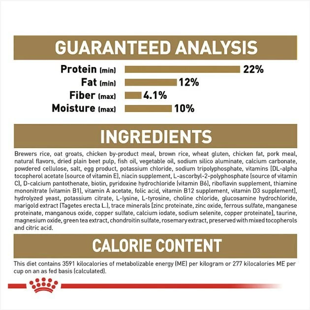 Brewers Rice, Oat Groats, Chicken By-Product Meal, Brown Rice, Wheat Gluten, Chicken Fat, Pork Meal, Natural Flavors, Dried Plain Beet Pulp, Fish Oil, Vegetable Oil, Sodium Silico Aluminate, Calcium Carbonate, Powdered Cellulose, Salt, Egg Product, Potassium Chloride, Sodium Tripolyphosphate, Vitamins [Dl-Alpha Tocopherol Acetate (Source Of Vitamin E), Niacin Supplement, L-Ascorbyl-2-Polyphosphate (Source Of Vitamin C), D-Calcium Pantothenate, Biotin, Pyridoxine Hydrochloride (Vitamin B6), Riboflavin Supplement, Thiamine Mononitrate (Vitamin B1), Vitamin A Acetate, Folic Acid, Vitamin B12 Supplement, Vitamin D3 Supplement], Hydrolyzed Yeast, Potassium Citrate, L-Lysine, L-Tyrosine, Choline Chloride, Glucosamine Hydrochloride, Marigold Extract (Tagetes Erecta L.), Trace Minerals [Zinc Proteinate, Zinc Oxide, Ferrous Sulfate, Manganese Proteinate, Manganous Oxide, Copper Sulfate, Calcium Iodate, Sodium Selenite, Copper Proteinate], Taurine, Magnesium Oxide, Green Tea Extract, Chondroitin Sulfate, Rosemary Extract, Preserved With Mixed Tocopherols And Citric Acid.
