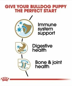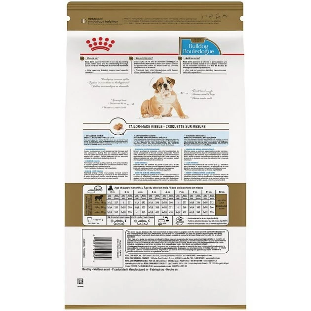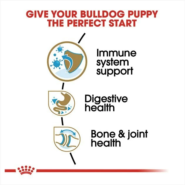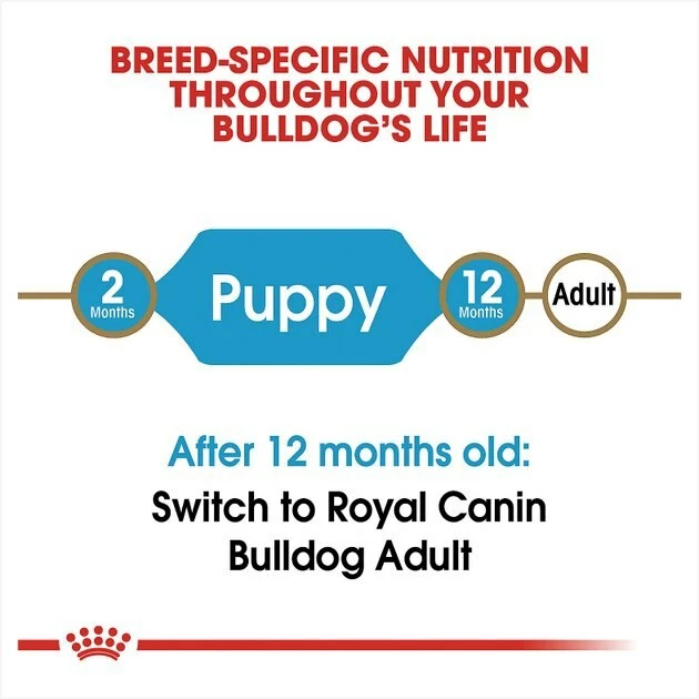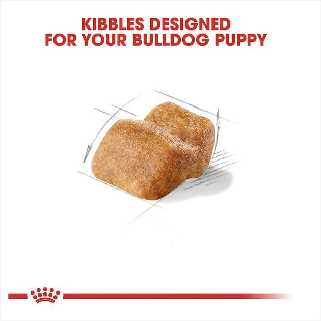 Royal Canin Breed Health Nutrition Bulldog Puppy Dry Dog Food is tailor-made nutrition created just for your pure breed Bulldog puppy. Whether you call yours an English Bulldog or British Bulldog, this exclusive breed-specific diet is uniquely formulated for your mid size dog with specific nutrients to help him thrive. The wave-shaped specialized kibble is specially designed for your medium breedโs unique jaw, making it easy for puppies to pick up and chew. An exclusive mix of antioxidants and vitamin E supports a young dogโs immune system and keeps his body growing strong. High-quality proteins and prebiotics help promote optimal stool quality. And for healthy development, this calcium- and phosphorus-fortified diet provides bone and joint support. Once your Bulldog puppy is over 15 months old, transition him from puppy dog food to Royal Canin Bulldog Adult Dog Food for precise nutrition into the adult years.