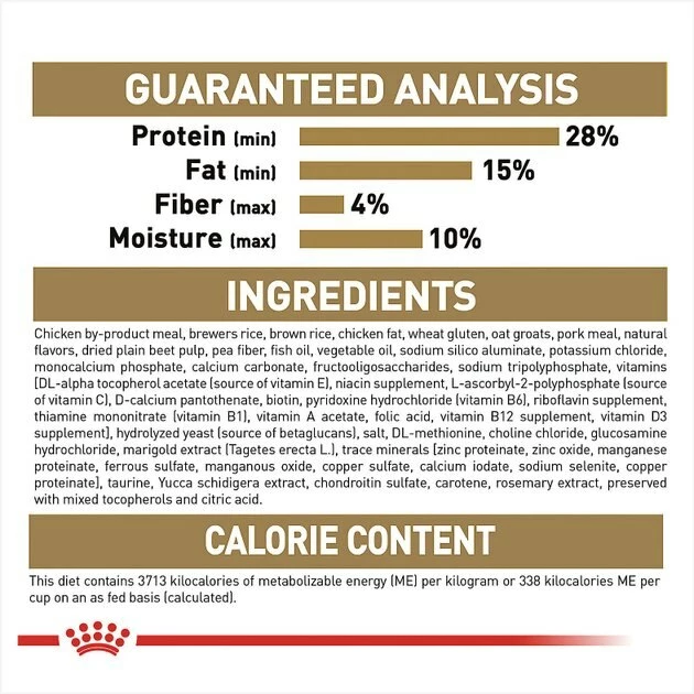 Chicken By-Product Meal, Brewers Rice, Brown Rice, Chicken Fat, Wheat Gluten, Oat Groats, Pork Meal, Natural Flavors, Dried Plain Beet Pulp, Pea Fiber, Fish Oil, Vegetable Oil, Sodium Silico Aluminate, Potassium Chloride, Monocalcium Phosphate, Calcium Carbonate, Fructooligosaccharides, Sodium Tripolyphosphate, Vitamins [Dl-Alpha Tocopherol Acetate (Source Of Vitamin E), Niacin Supplement, L-Ascorbyl-2-Polyphosphate (Source Of Vitamin C), D-Calcium Pantothenate, Biotin, Pyridoxine Hydrochloride (Vitamin B6), Riboflavin Supplement, Thiamine Mononitrate (Vitamin B1), Vitamin A Acetate, Folic Acid, Vitamin B12 Supplement, Vitamin D3 Supplement], Hydrolyzed Yeast (Source Of Betaglucans), Salt, Dl-Methionine, Choline Chloride, Glucosamine Hydrochloride, Marigold Extract (Tagetes Erecta L.), Trace Minerals [Zinc Proteinate, Zinc Oxide, Manganese Proteinate, Ferrous Sulfate, Manganous Oxide, Copper Sulfate, Calcium Iodate, Sodium Selenite, Copper Proteinate], Taurine, Yucca Schidigera Extract, Chondroitin Sulfate, Carotene, Rosemary Extract, Preserved With Mixed Tocopherols And Citric Acid.