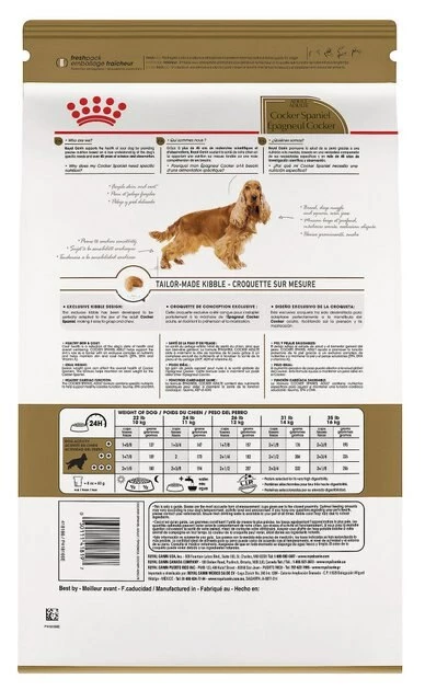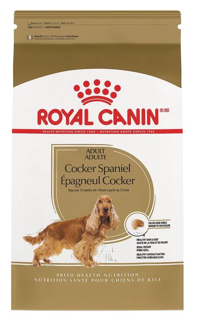 Royal Canin Breed Health Nutrition Cocker Spaniel Adult Dry Dog Food is tailor-made nutrition created just for your Cocker Spaniel pure breed. Whether you have an English Cocker Spaniel or an American Cocker Spaniel, this exclusive breed-specific diet is uniquely formulated for your mid size dog, with the specific nutrients to help him thrive. The specialized kibble is designed for your medium breed’s broad muzzle and square jaw, making it easy for him to pick up and chew. An appropriately balanced formula promotes a healthy weight, while targeted nutrients help maintain your Cocker Spaniel’s heart health. And this Cocker Spaniel dog food contains Vitamin A, as well as EPA and DHA from fish oil to help nourish healthy skin and coat.