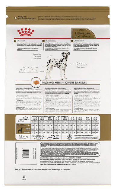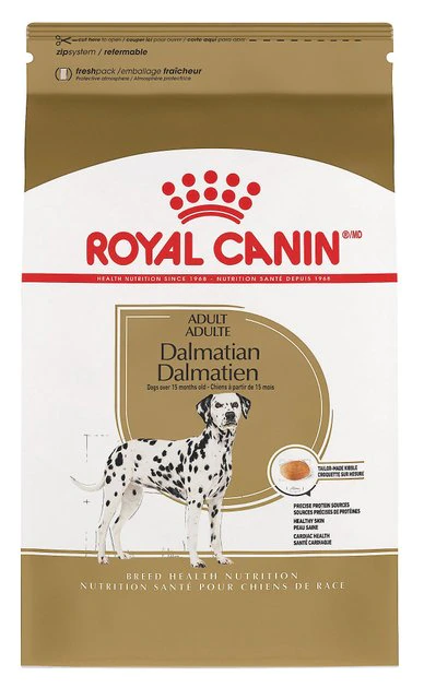 Royal Canin Breed Health Nutrition Dalmatian Adult Dry Dog Food is tailor-made nutrition created just for your Dalmatian pure breed. This exclusive breed-specific diet is uniquely formulated with specific nutrients to help your beloved spotted dog thrive. Its specialized kibble is designed for your large dogโs strong jaw and scissor bite, ensuring your dog can easily pick up and chew his food. A low purine content from carefully sourced egg- and plant-based proteins helps minimize the risk of any protein-based sensitivities to which some Dalmatians can be prone. B vitamins reinforce the skin barrier, while EPA and DHA from fish oil provide skin support and coat care. And this Dalmatian dog food contains essential nutrients like taurine, EPA, and DHA to help maintain a healthy heart.