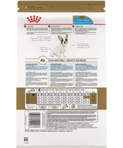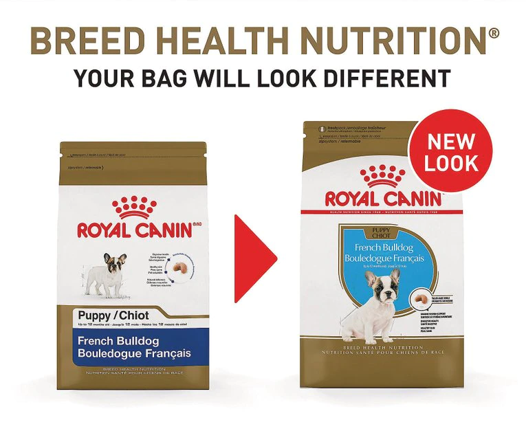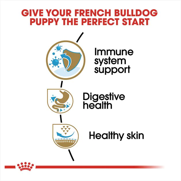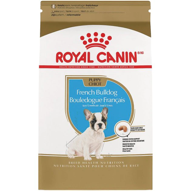 Royal Canin Breed Health Nutrition French Bulldog Puppy Dry Dog Food is tailor-made nutrition created just for your French Bulldog puppy pure breed. This exclusive breed-specific diet is uniquely formulated for your medium breed puppy, with the specific nutrients to help mid size dogs thrive. The curved-shaped specialized kibble is designed for your Frenchie’s short muzzle and underbite, making it easy for little dogs to pick up and chew. An exclusive mix of antioxidants and vitamin E promotes healthy development of his immune system to keep his body growing strong. Exclusive nutrients reinforce the skin barrier for skin support. And this French Bulldog dog food contains a combination of highly digestible proteins, precise fiber content, and high-quality carbohydrate sources to support healthy digestion and to help decrease flatulence and unpleasant stool odors. Once your French Bulldog puppy is over 12 months old, transition him to Royal Canin French Bulldog Adult Dry Dog Food for precise nutrition into his adult years.