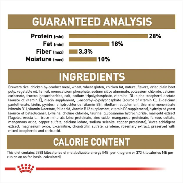 Brewers Rice, Chicken By-Product Meal, Wheat Gluten, Wheat, Chicken Fat, Natural Flavors, Dried Plain Beet Pulp, Fish Oil, Monocalcium Phosphate, Vegetable Oil, Sodium Silico Aluminate, Potassium Chloride, Calcium Carbonate, Vitamins [Dl-Alpha Tocopherol Acetate (Source Of Vitamin E), Inositol, Niacin Supplement, L-Ascorbyl-2-Polyphosphate (Source Of Vitamin C), D-Calcium Pantothenate, Biotin, Pyridoxine Hydrochloride (Vitamin B6), Riboflavin Supplement, Thiamine Mononitrate (Vitamin B1), Vitamin A Acetate, Folic Acid, Vitamin B12 Supplement, Vitamin D3 Supplement], Salt, Fructooligosaccharides, Sodium Tripolyphosphate, L-Lysine, Hydrolyzed Yeast, Choline Chloride, Taurine, Glucosamine Hydrochloride, Marigold Extract (Tagetes Erecta L.), Trace Minerals [Zinc Oxide, Zinc Proteinate, Ferrous Sulfate, Manganous Oxide, Manganese Proteinate, Copper Sulfate, Calcium Iodate, Sodium Selenite, Copper Proteinate], L-Carnitine, Chondroitin Sulfate, Rosemary Extract, Preserved With Mixed Tocopherols And Citric Acid.
