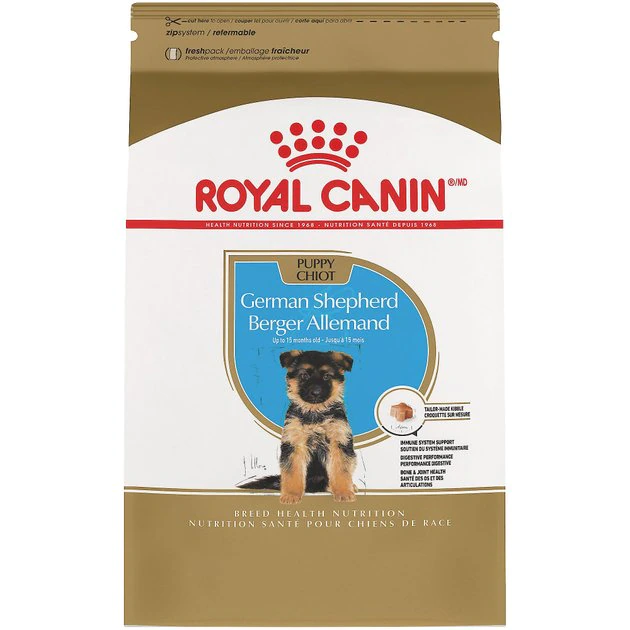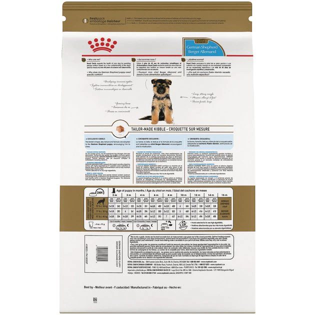 Royal Canin Breed Health Nutrition German Shepherd Puppy Dry Dog Food is tailor-made nutrition created just for your pure breed. Whether you call him a German Shepherd or an Alsatian, this exclusive breed-specific diet is uniquely formulated to your large breed puppy, with the specific nutrients to help young dogs thrive. The specialized kibble shape and texture are designed for your large dog’s long, strong muzzle and teeth, encouraging him to chew. An exclusive mix of antioxidants and vitamin E supports healthy development of puppies’ immune system and keeps his body growing strong. Highly digestible proteins and specific fibers maintain digestive health since this breed has a tendency to have poor stool quality. And glucosamine and chondroitin support bone and joint health and cartilage as your puppy grows to be a big dog. Once your German Shepherd puppy is over 15 months old, transition him from puppy dog food to Royal Canin German Shepherd Adult Dog Food for precise nutrition into his adult years.