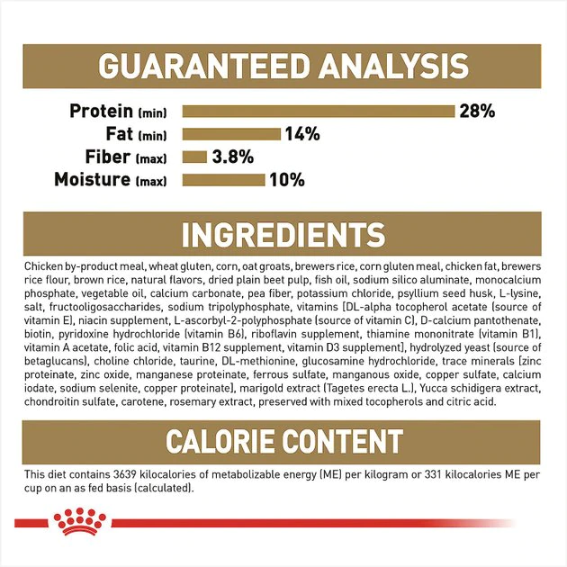 Chicken By-Product Meal, Wheat Gluten, Corn, Oat Groats, Brewers Rice, Corn Gluten Meal, Chicken Fat, Brewers Rice Flour, Brown Rice, Natural Flavors, Dried Plain Beet Pulp, Fish Oil, Sodium Silico Aluminate, Monocalcium Phosphate, Vegetable Oil, Calcium Carbonate, Pea Fiber, Potassium Chloride, Psyllium Seed Husk, L-Lysine, Salt, Fructooligosaccharides, Sodium Tripolyphosphate, Vitamins [Dl-Alpha Tocopherol Acetate (Source Of Vitamin E), Niacin Supplement, L-Ascorbyl-2-Polyphosphate (Source Of Vitamin C), D-Calcium Pantothenate, Biotin, Pyridoxine Hydrochloride (Vitamin B6), Riboflavin Supplement, Thiamine Mononitrate (Vitamin B1), Vitamin A Acetate, Folic Acid, Vitamin B12 Supplement, Vitamin D3 Supplement], Hydrolyzed Yeast (Source Of Betaglucans), Choline Chloride, Taurine, Dl-Methionine, Glucosamine Hydrochloride, Trace Minerals [Zinc Proteinate, Zinc Oxide, Manganese Proteinate, Ferrous Sulfate, Manganous Oxide, Copper Sulfate, Calcium Iodate, Sodium Selenite, Copper Proteinate], Marigold Extract (Tagetes Erecta L.), Yucca Schidigera Extract, Chondroitin Sulfate, Carotene, Rosemary Extract, Preserved With Mixed Tocopherols And Citric Acid.