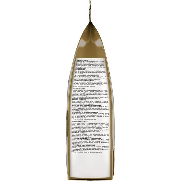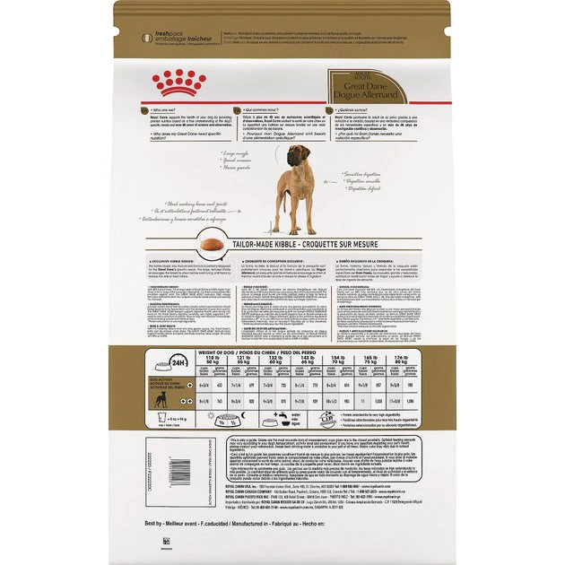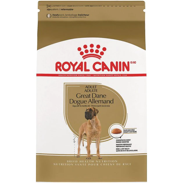 Royal Canin Breed Health Nutrition Great Dane Adult Dry Dog Food is tailor-made nutrition created just for your Great Dane pure breed. This exclusive breed-specific diet is uniquely formulated for your giant breed, with the specific nutrients to help big dogs thrive. The large, specialized kibble is designed for your Great Daneโs very large jaw, encouraging him to chew and slowly eat his food. Concentrated energy content meets your large dogโs nutrition needs without overloading his stomach. Highly digestible proteins and specific fibers support healthy digestion. And this Great Dane dog food contains EPA and DHA from fish oil to provide bone and joint support in your magnificent giant dog.