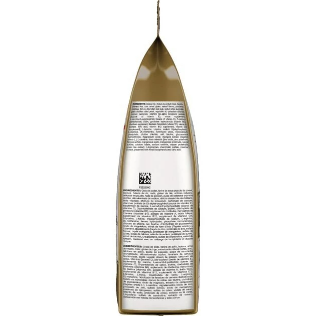 Chicken Fat, Chicken By-Product Meal, Tapioca, Brewers Rice, Corn, Wheat Gluten, Natural Flavors, Powdered Cellulose, Fish Oil, Dried Plain Beet Pulp, Sodium Silico Aluminate, Grain Distillers Dried Yeast, Vegetable Oil, Potassium Chloride, Calcium Carbonate, Vitamins [Dl-Alpha Tocopherol Acetate (Source Of Vitamin E), Niacin Supplement, L-Ascorbyl-2-Polyphosphate (Source Of Vitamin C), D-Calcium Pantothenate, Biotin, Pyridoxine Hydrochloride (Vitamin B6), Riboflavin Supplement, Thiamine Mononitrate (Vitamin B1), Vitamin A Acetate, Folic Acid, Vitamin B12 Supplement, Vitamin D3 Supplement], L-Tyrosine, L-Lysine, Sodium Tripolyphosphate, L-Arginine, Dl-Methionine, Hydrolyzed Yeast, Monocalcium Phosphate, Choline Chloride, Salt, Taurine, Glucosamine Hydrochloride, Magnesium Oxide, Marigold Extract (Tagetes Erecta L.), L-Carnitine, Trace Minerals [Zinc Oxide, Zinc Proteinate, Ferrous Sulfate, Manganous Oxide, Manganese Proteinate, Copper Sulfate, Calcium Iodate, Sodium Selenite, Copper Proteinate], Green Tea Extract, L-Tryptophan, Chondroitin Sulfate, Rosemary Extract, Preserved With Mixed Tocopherols And Citric Acid.