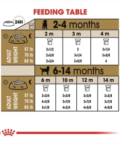 | Age | Adult Target Weight 57 lbs Daily Feeding (cup) | Adult Target Weight 70 lbs Daily Feeding (cup) | Adult Target Weight 88 lbs Daily Feeding (cup) |
