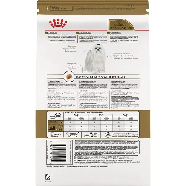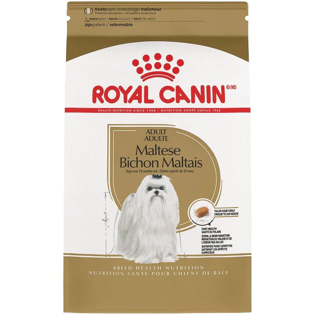 Royal Canin Breed Health Nutrition Maltese Adult Dry Dog Food is tailor-made nutrition created just for your Maltese pure breed. This exclusive breed-specific diet is uniquely formulated for your Maltese, with the specific nutrients to help small breeds thrive. The specialized kibble is designed for your little dog’s medium-length tapered muzzle and scissor bite, making it easy for small dogs to pick up and chew. Biotin, omega-3, and omega-6 fatty acids, including EPA and DHA from fish oil, provide skin care and helps maintain your Maltese’s silky, long coat. Highly digestible proteins and precise fiber content support healthy digestion to help reduce stools and unpleasant stool odors. And to please your picky eater, the combination of this Maltese dog food’s kibble size, exceptional aromas, and flavors will keep them happily satisfied.