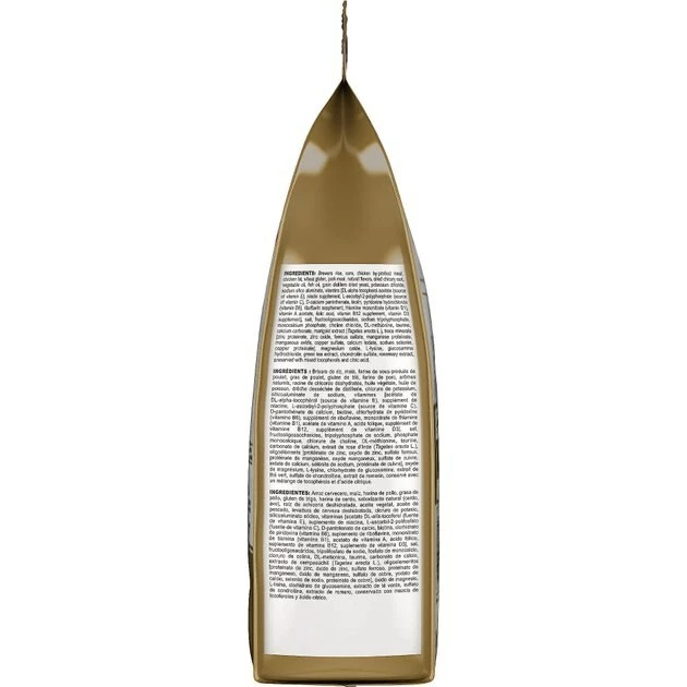 Brewers Rice, Corn, Chicken By-Product Meal, Chicken Fat, Wheat Gluten, Pork Meal, Natural Flavors, Dried Chicory Root, Vegetable Oil, Fish Oil, Grain Distillers Dried Yeast, Potassium Chloride, Sodium Silico Aluminate, Vitamins [Dl-Alpha Tocopherol Acetate (Source Of Vitamin E), Inositol, Niacin Supplement, L-Ascorbyl-2-Polyphosphate (Source Of Vitamin C), D-Calcium Pantothenate, Biotin, Pyridoxine Hydrochloride (Vitamin B6), Riboflavin Supplement, Thiamine Mononitrate (Vitamin B1), Vitamin A Acetate, Folic Acid, Vitamin B12 Supplement, Vitamin D3 Supplement], Salt, Fructooligosaccharides, Sodium Tripolyphosphate, Monocalcium Phosphate, Choline Chloride, Dl-Methionine, Taurine, Calcium Carbonate, Marigold Extract (Tagetes Erecta L.), Trace Minerals [Zinc Proteinate, Zinc Oxide, Ferrous Sulfate, Manganese Proteinate, Manganous Oxide, Copper Sulfate, Calcium Iodate, Sodium Selenite, Copper Proteinate], Magnesium Oxide, L-Lysine, Glucosamine Hydrochloride, Green Tea Extract, Chondroitin Sulfate, Rosemary Extract, Preserved With Mixed Tocopherols And Citric Acid.