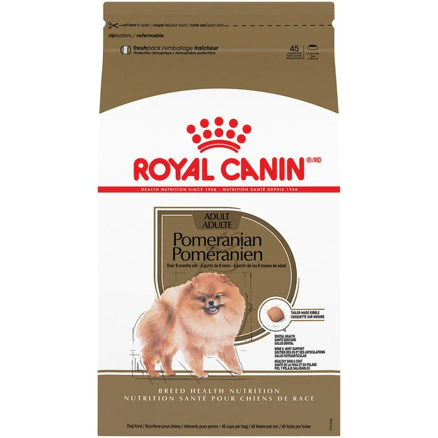 Treat your Pom to kibble made just for him with Royal Canin Breed Health Nutrition Pomeranian Adult Dry Dog Food. This nutritious high-quality food is specially made for your purebred Pomeranian. The small kibble size is pawfect for your pupโs tiny teeth and helps reduce tartar buildup. A balanced blend of fiber and protein aids with healthy digestion, while key nutrients help support his delicate joints, knees and bones. Plus, itโs made with EPA and DHA to help your fluffy friend maintain a beautiful, healthy coat.