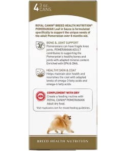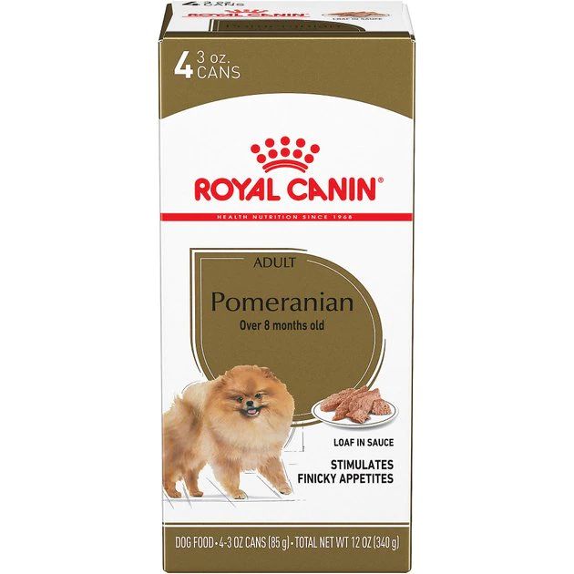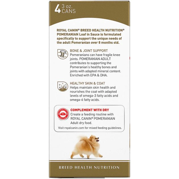 Treat your perky pup to good health and great flavor with Royal Canin Breed Health Nutrition Pomeranian Adult Loaf in Sauce Canned Dog Food. This nutritious pate is specially made for your adult, purebred Pomeranian. The soft and savory formula pleases picky eaters and can be mixed with dry food for a more tempting taste. A balanced blend of fiber and protein aids with healthy digestion, while key nutrients help support delicate joints, knees and bones. Plus, itโs made with EPA and DHA to help your fluffy friend maintain a beautiful, healthy coat.