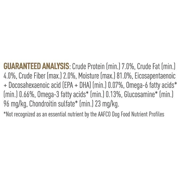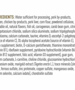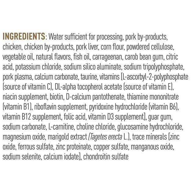 Water Sufficient For Processing, Pork By-Products, Chicken, Chicken By-Products, Pork Liver, Corn Flour, Powdered Cellulose, Vegetable Oil, Natural Flavors, Fish Oil, Carrageenan, Carob Bean Gum, Citric Acid, Potassium Chloride, Sodium Silico Aluminate, Sodium Tripolyphosphate, Pork Plasma, Calcium Carbonate, Taurine, Vitamins [L-Ascorbyl-2-Polyphosphate (Source Of Vitamin C), Dl-Alpha Tocopherol Acetate (Source Of Vitamin E), Niacin Supplement, Biotin, D-Calcium Pantothenate, Thiamine Mononitrate (Vitamin B1), Riboflavin Supplement, Pyridoxine Hydrochloride (Vitamin B6), Vitamin B12 Supplement, Folic Acid, Vitamin D3 Supplement], Guar Gum, Sodium Carbonate, L-Carnitine, Choline Chloride, Glucosamine Hydrochloride, Magnesium Oxide, Marigold Extract (Tagetes Erecta L.), Trace Minerals [Zinc Oxide, Ferrous Sulfate, Zinc Proteinate, Copper Sulfate, Manganous Oxide, Sodium Selenite, Calcium Iodate], Chondroitin Sulfate.