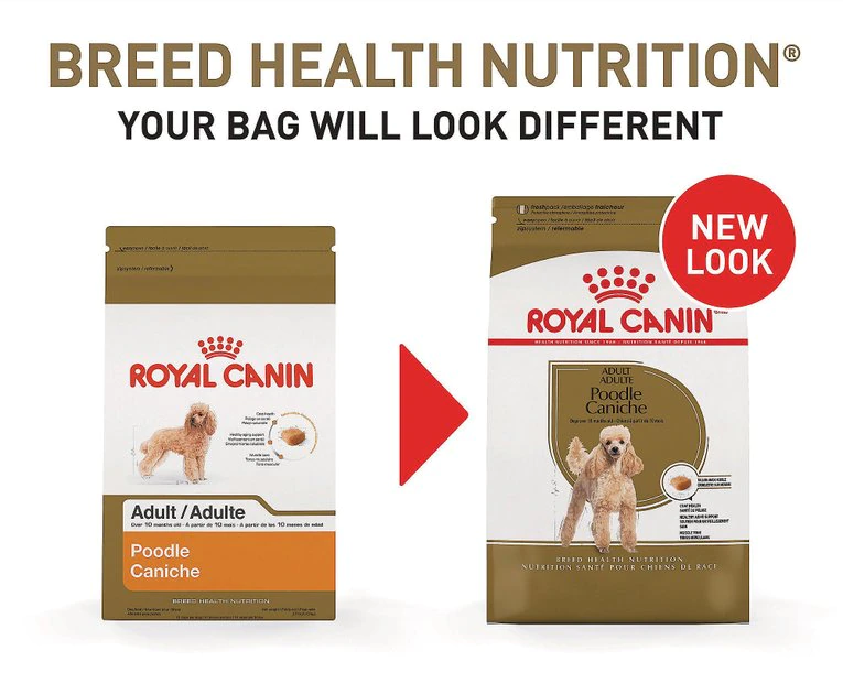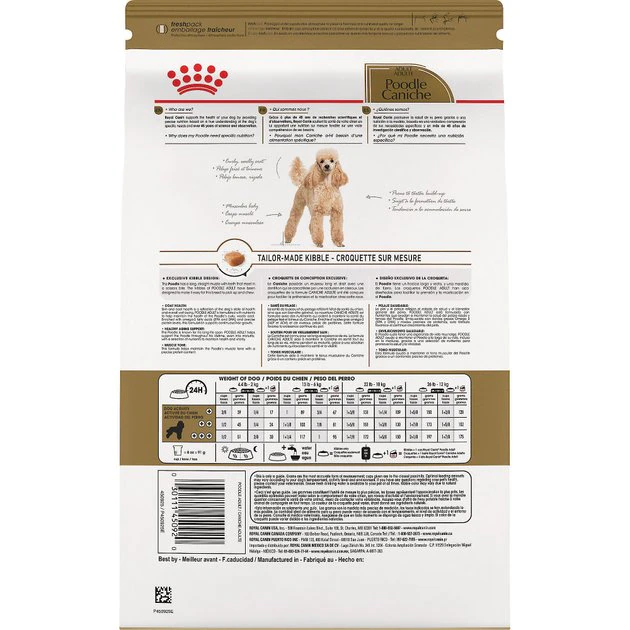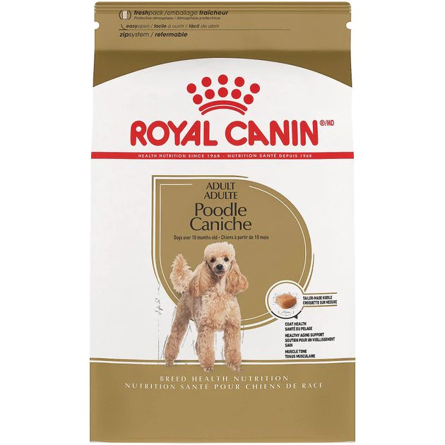 Royal Canin Breed Health Nutrition Poodle Adult Dry Dog Food is tailor-made nutrition created just for your Poodle pure breed. This exclusive breed-specific diet is uniquely formulated for your Poodle, with the specific nutrients to help him thrive. The specialized kibble is designed for your Poodleโs straight muzzle and jaw, making it easy for him to pick up and chew. EPA and DHA from fish oil help provide skin support and coat care. Precise protein content provides muscle support. And this Poodle dog food has an exclusive blend of antioxidants to support healthy aging as your beloved mid size dog reaches maturity. Mix in or complement with Royal Canin Poodle Wet Dog Food for a meal thatโs sure to please your Poodle. And once your Poodle is over 8 years old, transition him to Royal Canin Poodle Adult 8+ Dog Food for precise nutrition into the golden years.