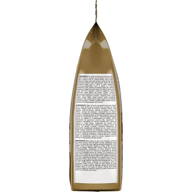 Corn, Brewers Rice, Wheat Gluten, Chicken By-Product Meal, Chicken Fat, Corn Gluten Meal, Natural Flavors, Dried Plain Beet Pulp, Vegetable Oil, Fish Oil, Grain Distillers Dried Yeast, Powdered Cellulose, Potassium Chloride, Calcium Sulfate, L-Lysine, Sodium Silico Aluminate, Dl-Methionine, Calcium Carbonate, Fructooligosaccharides, Sodium Tripolyphosphate, Salt, Taurine, Vitamins [Dl-Alpha Tocopherol Acetate (Source of Vitamin E), Inositol, Niacin Supplement, L-Ascorbyl-2-Polyphosphate (Source of Vitamin C), D-Calcium Pantothenate, Biotin, Pyridoxine Hydrochloride (Vitamin B6), Riboflavin Supplement, Thiamine Mononitrate (Vitamin B1), Vitamin A Acetate, Folic Acid, Vitamin B12 Supplement, Vitamin D3 Supplement], Choline Chloride, L-Cystine, L-Tyrosine, Marigold Extract (Tagetes Erecta L.), Glucosamine Hydrochloride, Trace Minerals [Zinc Proteinate, Zinc Oxide, Ferrous Sulfate, Manganese Proteinate, Manganous Oxide, Copper Sulfate, Calcium Iodate, Sodium Selenite, Copper Proteinate], Tea, L-Carnitine, Chondroitin Sulfate, Rosemary Extract, Preserved with Mixed Tocopherols and Citric Acid.