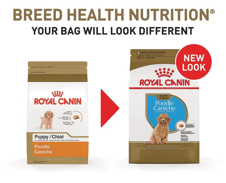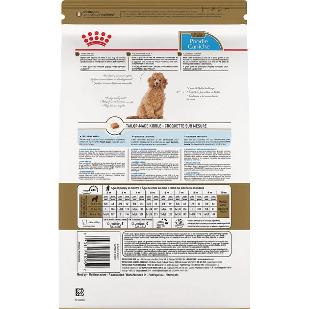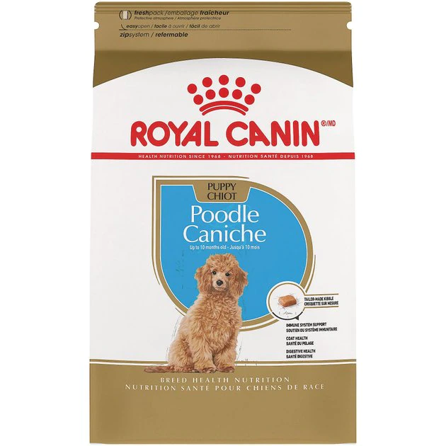 Royal Canin Breed Health Nutrition Poodle Puppy Dry Dog Food is tailor-made nutrition created just for your Poodle pure breed puppy. This exclusive breed-specific diet is uniquely formulated for your mid size breed puppy with specific nutrients to help puppies thrive. The specialized kibble is designed for your Poodle’s straight muzzle and jaw, making it easy for him to pick up and chew. An exclusive mix of antioxidants and vitamin E supports the healthy development of his immune system and keeps his body growing strong. EPA and DHA from fish oil help provide skin support and coat care. And high-quality proteins and prebiotics promote healthy digestion and optimal stool quality. Once your Poodle is over 10 months old, transition him from puppy dog food to Royal Canin Poodle Adult Dog Food for precise nutrition into the adult years.