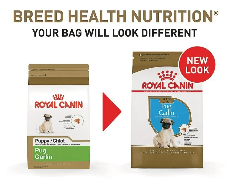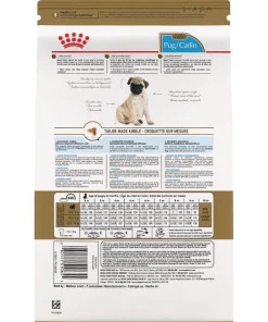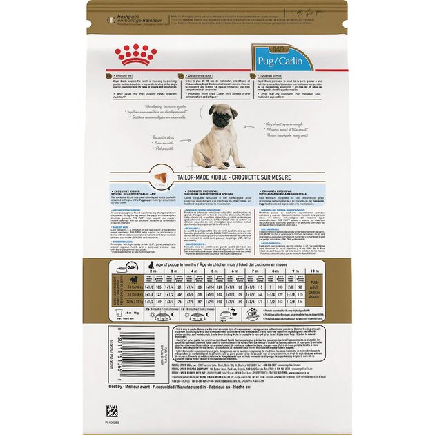 Royal Canin Breed Health Nutrition Pug Puppy Dry Dog Food is tailor-made nutrition created just for your Pug pure breed puppy. This exclusive breed-specific diet is uniquely formulated for puppies, with the specific nutrients to help small dogs thrive. The specialized kibble is designed for your small breedโs short, square muzzle, making it easy for him to pick up and chew. An exclusive mix of antioxidants, including vitamin E, supports healthy development of his immune system and keeps his body growing strong. Essential nutrients like EPA and DHA from fish oil help provide skin care and coat care. And this Pug dog food contains high-quality proteins and prebiotics to promote healthy digestion and optimal stool quality. Once your Pug is over 10 months old, transition him from puppy dog food to Royal Canin Pug Adult Dog Food for precise nutrition into the adult years.