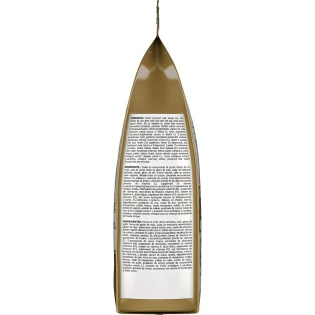 Brewers Rice, Chicken By-Product Meal, Corn, Chicken Fat, Dried Plain Beet Pulp, Corn Gluten Meal, Natural Flavors, Wheat Gluten, Fish Oil, Calcium Carbonate, Monocalcium Phosphate, Sodium Silico Aluminate, Vegetable Oil, Dl-Methionine, Potassium Chloride, Salt, Fructooligosaccharides, Sodium Tripolyphosphate, L-Tyrosine, L-Lysine, Hydrolyzed Yeast, Vitamins [Dl-Alpha Tocopherol Acetate (Source of Vitamin E), Inositol, Niacin Supplement, L-Ascorbyl-2-Polyphosphate (Source of Vitamin C), D-Calcium Pantothenate, Biotin, Pyridoxine Hydrochloride (Vitamin B6), Riboflavin Supplement, Thiamine Mononitrate (Vitamin B1), Vitamin A Acetate, Folic Acid, Vitamin B12 Supplement, Vitamin D3 Supplement], Choline Chloride, Taurine, Marigold Extract (Tagetes Erecta L.), Trace Minerals [Zinc Proteinate, Zinc Oxide, Ferrous Sulfate, Manganese Proteinate, Manganous Oxide, Copper Sulfate, Calcium Iodate, Sodium Selenite, Copper Proteinate], L-Carnitine, Rosemary Extract, Preserved with Mixed Tocopherols and Citric Acid.