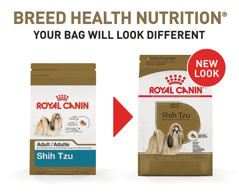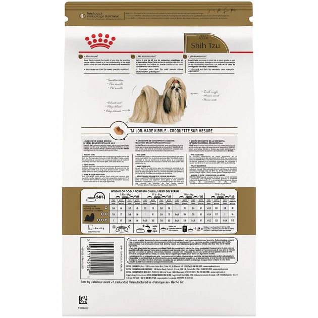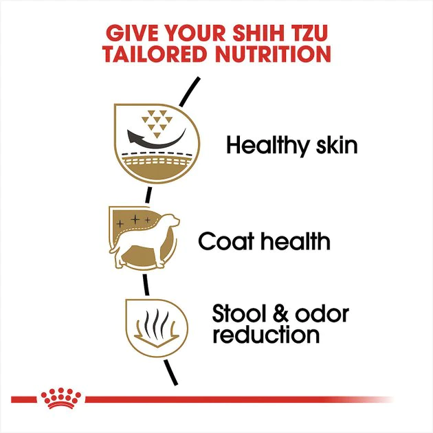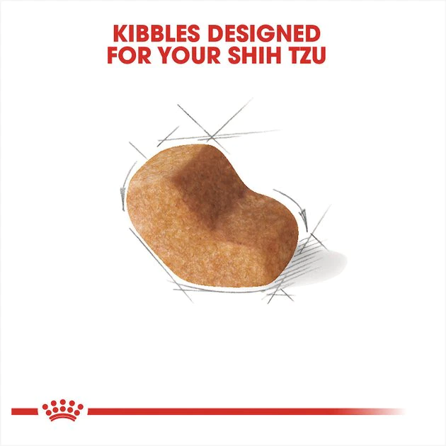 Royal Canin Breed Health Nutrition Shih Tzu Adult Dry Dog Food is tailor-made nutrition created just for your Shih Tzu pure breed. This exclusive breed-specific diet is uniquely formulated for your small breed with specific nutrients to help him thrive. The specialized kibble shape and texture are designed for your small dogโs short muzzle and underbite, making it easy for your toy breed to pick up and chew. An exclusive complex of nutrients reinforces the skin barrier to maintain your Shih Tzuโs skin health. Omega-3 and omega-6 fatty acids and biotin give long coats softness and shine. And this Shih Tzu dog food has a combination of highly digestible proteins, precise fiber content, and high-quality carbohydrate sources to support healthy digestion to help reduce stool volume. Mix in or complement with Royal Canin Shih Tzu Adult Wet Dog Food for a tasty meal thatโs sure to please picky eaters and your little lionโs appetite.