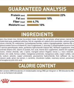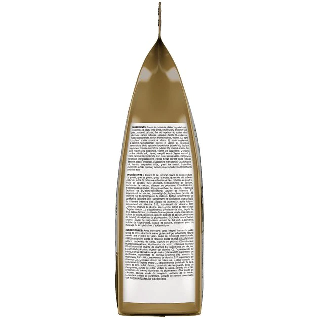 Brewers Rice, Brown Rice, Chicken By-Product Meal, Chicken Fat, Oat Groats, Wheat Gluten, Natural Flavors, Dried Plain Beet Pulp, Powdered Cellulose, Fish Oil, Vegetable Oil, Sodium Silico Aluminate, Calcium Carbonate, Potassium Chloride, Dl-Methionine, L-Tyrosine, Fructooligosaccharides, Sodium Tripolyphosphate, Salt, Taurine, Vitamins [Dl-Alpha Tocopherol Acetate (Source of Vitamin E), Inositol, Niacin Supplement, L-Ascorbyl-2-Polyphosphate (Source of Vitamin C), D-Calcium Pantothenate, Biotin, Pyridoxine Hydrochloride (Vitamin B6), Riboflavin Supplement, Thiamine Mononitrate (Vitamin B1), Vitamin A Acetate, Folic Acid, Vitamin B12 Supplement, Vitamin D3 Supplement], Choline Chloride, L-Lysine, Marigold Extract (Tagetes Erecta L.), Monocalcium Phosphate, Glucosamine Hydrochloride, Trace Minerals [Zinc Proteinate, Zinc Oxide, Ferrous Sulfate, Manganese Proteinate, Manganous Oxide, Copper Sulfate, Calcium Iodate, Sodium Selenite, Copper Proteinate], Tea, L-Carnitine, Chondroitin Sulfate, Rosemary Extract, Reserved with Mixed Tocopherols and Citric Acid.