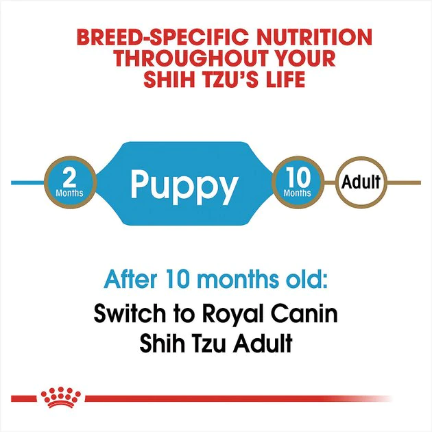 Royal Canin Breed Health Nutrition Shih Tzu Puppy Dry Dog Food is tailor-made nutrition created just for your Shih Tzu puppy pure breed. This exclusive breed-specific diet is uniquely formulated for puppies with specific nutrients to help small dogs thrive. The specialized kibble shape and texture are designed for your small breed Shih Tzuโs short muzzle and underbite, making it easy for toy breeds to pick up and chew. An exclusive complex of nutrients reinforces the skin barrier to maintain your Shih Tzuโs skin health. EPA, DHA, and vitamin A help promote the growth of a healthy coat. And to support your puppyโs digestive system, this Shih Tzu dog food contains high-quality proteins and prebiotics to help promote optimal stool quality. Once your Shih Tzu puppy is over 10 months old, transition him from puppy dog food to Royal Canin Shih Tzu Adult Dog Food for precise nutrition into his adult years.
