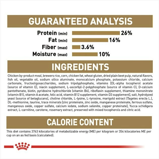 Brewers Rice, Chicken By-Product Meal, Corn, Chicken Fat, Wheat Gluten, Dried Plain Beet Pulp, Natural Flavors, Fish Oil, Calcium Carbonate, Vegetable Oil, Sodium Silico Aluminate, Monocalcium Phosphate, Potassium Chloride, Salt, Fructooligosaccharides, Dl-Methionine, Sodium Tripolyphosphate, Hydrolyzed Yeast, Taurine, Choline Chloride, Vitamins [Dl-Alpha Tocopherol Acetate (Source of Vitamin E), Inositol, Niacin Supplement, L-Ascorbyl-2-Polyphosphate (Source of Vitamin C), D-Calcium Pantothenate, Biotin, Pyridoxine Hydrochloride (Vitamin B6), Riboflavin Supplement, Thiamine Mononitrate (Vitamin B1), Vitamin A Acetate, Folic Acid, Vitamin B12 Supplement, Vitamin D3 Supplement], L-Lysine, L-Tyrosine, Marigold Extract (Tagetes Erecta L.), Trace Minerals [Zinc Oxide, Ferrous Sulfate, Zinc Proteinate, Manganous Oxide, Manganese Proteinate, Copper Sulfate, Calcium Iodate, Sodium Selenite, Copper Proteinate], L-Carnitine, Rosemary Extract, Preserved with Mixed Tocopherols and Citric Acid.