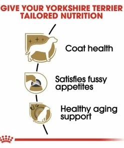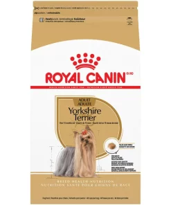 Royal Canin Breed Health Nutrition Yorkshire Terrier Adult Dry Dog Food is tailor-made nutrition created just for your Yorkie pure breed. This exclusive breed-specific diet is uniquely formulated for your small breed Yorkshire Terrier with specific nutrients to help small dogs thrive. The specialized kibble shape and texture are designed for your toy breedโs small jaw, making it easy for little dogs to pick up and chew. Biotin and omega-3 and -6 fatty acids help maintain healthy skin and coat. Targeted nutrients including vitamin C, EPA, and DHA help support your toy dogโs vitality. And the combination of this Yorkie dog foodโs kibble shape and texture helps reduce tartar formation by encouraging your Yorkie to chew.