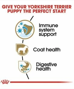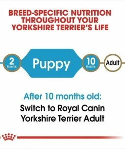 Royal Canin Breed Health Nutrition Yorkshire Terrier Puppy Dry Dog Food is tailor-made nutrition created just for your Yorkie pure breed puppy. This exclusive breed-specific diet is uniquely formulated for small breed puppies with specific nutrients to small dogs thrive. The specialized kibble shape and texture are designed for your Yorkshire Terrierโs short muzzle and level bite, making it easy for toy breeds to pick up and chew. An exclusive mix of antioxidants and vitamin E supports his developing immune system and keeps his body growing strong. Optimal levels of omega-3 and omega-6 fatty acids, plus biotin, help maintain healthy skin and coat. And high-quality proteins and prebiotics support healthy digestion to help promote optimal stool quality and reduce unpleasant stool odors. Once your Yorkshire Terrier puppy is over 10 months old, transition him from puppy dog food to Royal Canin Yorkshire Terrier Adult Dog Food for precise nutrition into their adult years.