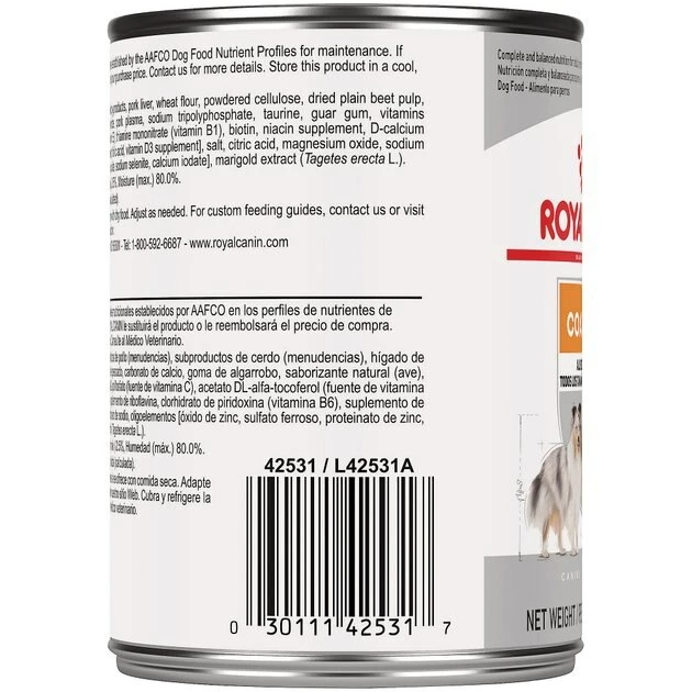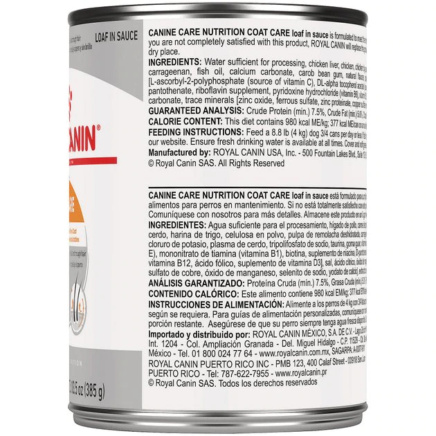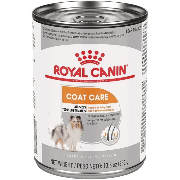 Royal Canin Coat Care Wet Dog Food is tailored nutrition to help bring out your dog’s shiny, soft coat. This exclusive soft dog food is designed with precise nutrients to support coat health and encourage hair growth. The complete and balanced diet also helps support coat vigor and shine. Mix this wet food with Royal Canin Coat Care Dry Adult Dog Food for a variety of textures to please picky eaters. Plus, to maintain your dog’s irresistible softness and shine, make sure to continue routine grooming, including bathing your dog with a dog-friendly shampoo.