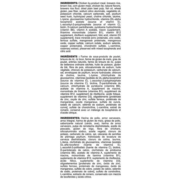 Chicken By-Product Meal, Brewers Rice, Brown Rice, Corn Gluten Meal, Chicken Fat, Natural Flavors, Brewers Rice Flour, Dried Plain Beet Pulp, Fish Oil, Wheat Gluten, Pea Fiber, Sodium Silico Aluminate, Vegetable Oil, Potassium Chloride, Calcium Carbonate, Salt, Psyllium Seed Husk, Hydrolyzed Yeast, Choline Chloride, Taurine, L-Lysine, Glucosamine Hydrochloride, Vitamins [Dl-Alpha Tocopherol Acetate (Source Of Vitamin E), L-Ascorbyl-2-Polyphosphate (Source Of Vitamin C), Biotin, D-Calcium Pantothenate, Pyridoxine Hydrochloride (Vitamin B6), Vitamin A Acetate, Niacin Supplement, Thiamine Mononitrate (Vitamin B1), Vitamin B12 Supplement, Riboflavin Supplement, Folic Acid, Vitamin D3 Supplement], Trace Minerals [Zinc Proteinate, Zinc Oxide, Ferrous Sulfate, Manganese Proteinate, Manganous Oxide, Copper Sulfate, Calcium Iodate, Sodium Selenite, Copper Proteinate], Chondroitin Sulfate, L-Carnitine, Rosemary Extract, Preserved With Mixed Tocopherols And Citric Acid.