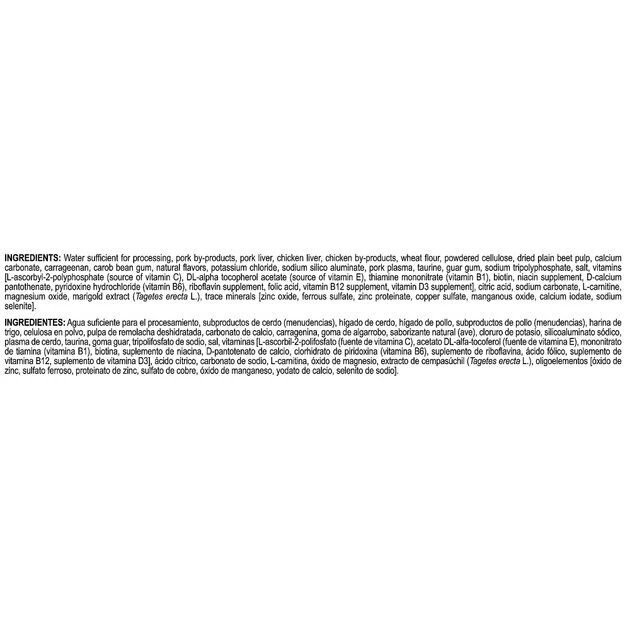 New Formula: Water Sufficient For Processing, Pork By-Products, Pork Liver, Chicken Liver, Chicken By-Products, Wheat Flour, Powdered Cellulose, Dried Plain Beet Pulp, Calcium Carbonate, Carrageenan, Carob Bean Gum, Natural Flavors, Potassium Chloride, Sodium Silico Aluminate, Pork Plasma, Taurine, Guar Gum, Sodium Tripolyphosphate, Salt, Vitamins [L-Ascorbyl-2-Polyphosphate (Source Of Vitamin C), Dl-Alpha Tocopherol Acetate (Source Of Vitamin E), Thiamine Mononitrate (Vitamin B1), Biotin, Niacin Supplement, D-Calcium Pantothenate, Pyridoxine Hydrochloride (Vitamin B6), Riboflavin Supplement, Folic Acid, Vitamin B12 Supplement, Vitamin D3 Supplement], Citric Acid, Sodium Carbonate, L-Carnitine, Magnesium Oxide, Marigold Extract (Tagetes Erecta L.), Trace Minerals [Zinc Oxide, Ferrous Sulfate, Zinc Proteinate, Copper Sulfate, Manganous Oxide, Calcium Iodate, Sodium Selenite].