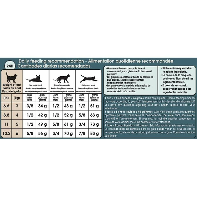 This is only a guide. Optimal feeding amounts may vary according to your pet’s temperament, activity level and environment. If you have any questions regarding your pet’s health, please contact your veterinarian.