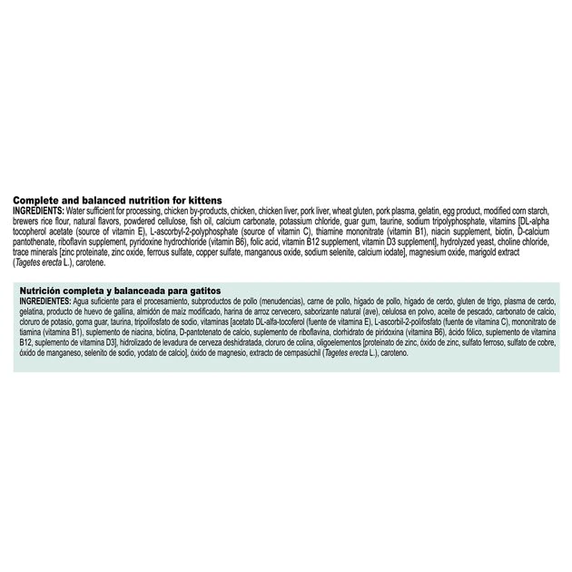 Water Sufficient For Processing, Chicken By-Products, Chicken, Chicken Liver, Pork Liver, Wheat Gluten, Pork Plasma, Gelatin, Egg Product, Modified Corn Starch, Brewers Rice Flour, Natural Flavors, Powdered Cellulose, Fish Oil, Calcium Carbonate, Potassium Chloride, Guar Gum, Taurine, Sodium Tripolyphosphate, Vitamins [DL-Alpha Tocopherol Acetate (Source Of Vitamin E), L-Ascorbyl-2-Polyphosphate (Source Of Vitamin C), Thiamine Mononitrate (Vitamin B1), Niacin Supplement, Biotin, D-Calcium Pantothenate, Riboflavin Supplement, Pyridoxine Hydrochloride (Vitamin B6), Folic Acid, Vitamin B12 Supplement, Vitamin D3 Supplement], Hydrolyzed Yeast, Choline Chloride, Trace Minerals [Zinc Proteinate, Zinc Oxide, Ferrous Sulfate, Copper Sulfate, Manganous Oxide, Sodium Selenite, Calcium Iodate], Magnesium Oxide, Marigold Extract (Tagetes Erecta L.), Carotene.