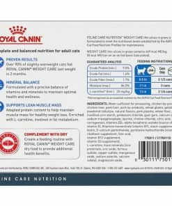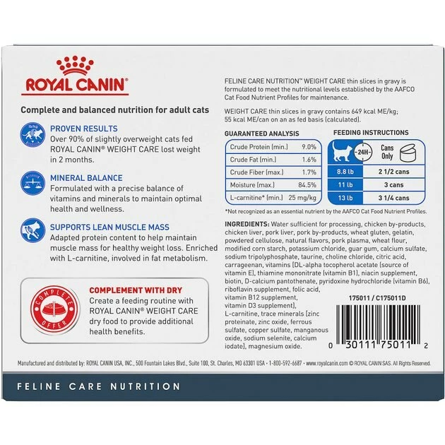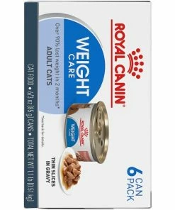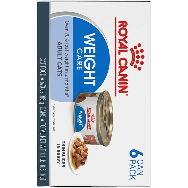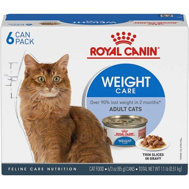 Created with your catβs weight management in mind, Royal Canin Feline Weight Care Thin Slices in Gravy Adult Wet Cat Food helps slightly overweight cats achieve an ideal weight in a delicious soft, wet formula. With a precise balance of vitamins and minerals, it can help maintain optimal health and wellness. To enhance mealtime palatability, this wet cat food can be paired with Weight Care dry cat kibble. Itβs formulated for cats with a body condition score of 4, 5, or 6 out of 9, to help provide muscle support and a more ideal body condition. If you need to schedule your catβs yearly annual exam, youβre concerned that she may have a body condition score of 7 out of 9 or above, or you have any other questions about her health, consult your veterinarian.