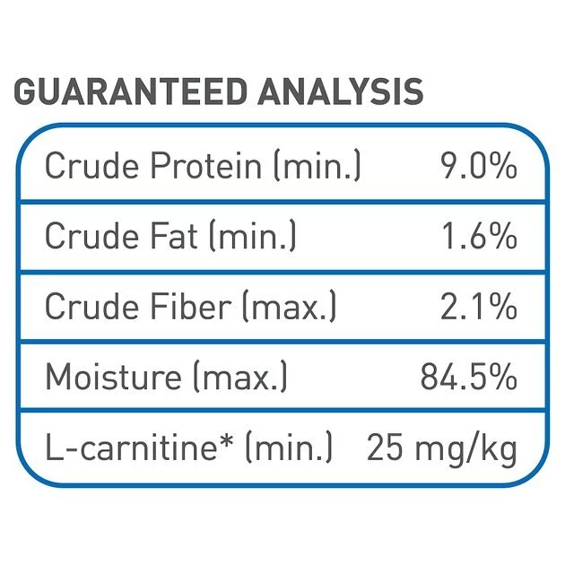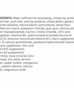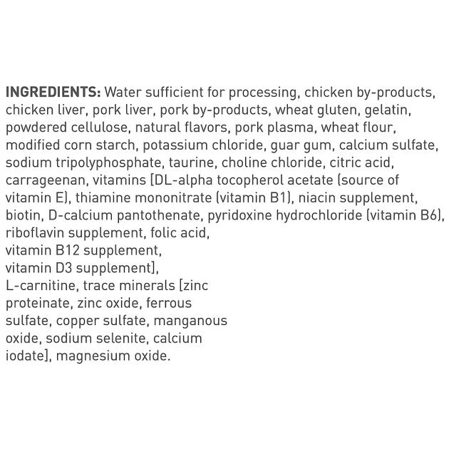 Water Sufficient For Processing, Pork By-Products, Pork Liver, Chicken By-Products, Chicken Liver, Wheat Gluten, Powdered Cellulose, Brewers Rice Flour, Pork Plasma, Gelatin, Hydrolyzed Chicken Liver, Calcium Sulfate, Guar Gum, Carrageenan, Potassium Chloride, Carob Bean Gum, Natural Flavors, Sodium Tripolyphosphate, Taurine, Choline Chloride, Vitamins [Dl-Alpha Tocopherol Acetate (Source Of Vitamin E), Thiamine Mononitrate (Vitamin B1), Niacin Supplement, Biotin, D-Calcium Pantothenate, Pyridoxine Hydrochloride (Vitamin B6), Riboflavin Supplement, Folic Acid, Vitamin B12 Supplement, Vitamin D3 Supplement], L-Carnitine, Trace Minerals [Zinc Proteinate, Zinc Oxide, Ferrous Sulfate, Copper Sulfate, Manganous Oxide, Calcium Iodate, Sodium Selenite].