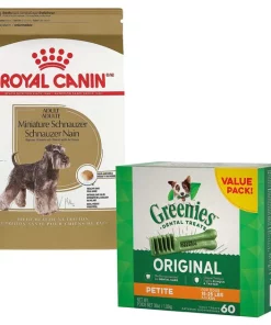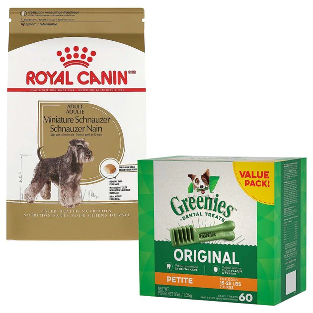 Please your little pup with this bundle of Royal Canin Miniature Schnauzer Adult Dry Food + Greenies Petite Dental Dog Treats! The Royal Canin formula is designed exclusively for pure breed Miniature Schnauzers over 10 months. Is your Miniature Schnauzerโs coat not as colorful or vivid as you remember? Their coat color is dependent upon certain nutrients โ deficiencies of those nutrients can actually cause depigmentation of the hair. The breed is also prone to weight gain and dental issues. This is why it’s important to feed a diet that is tailor-made for their specific needs. Plus, just one Greenies Original Petite Natural Dental Dog Treats a day will give your best friend cleaner teeth, fresher breath and a big helping of mouth-wowing flavor! A uniquely chewy texture helps them tackle plaque and tartar all the way down to the gumline, while natural and highly digestible ingredients fortified with vitamins, minerals and other nutrients make them tummy friendly and grr-eat for your pup!
