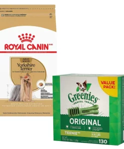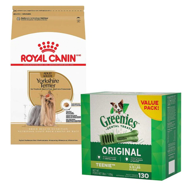 - Each purchase comes with Royal Canin Yorkshire Terrier Adult Dry Dog Food, 10-lb bag & Greenies Teenie Dental Dog Treats, 130 count.