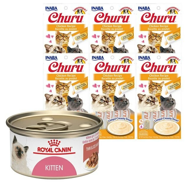 Royal Canin Feline Health Nutrition Thin Slices in Gravy Wet Food is created with the optimal balance among proteins, fats and carbohydrates to support long-term health. The Inaba Churu Grain-Free Chicken Puree Lickable Cat Treatz tube is a grain-free, creamy puree treat made with real, farm-raised chicken for the protein and flavor cats love.