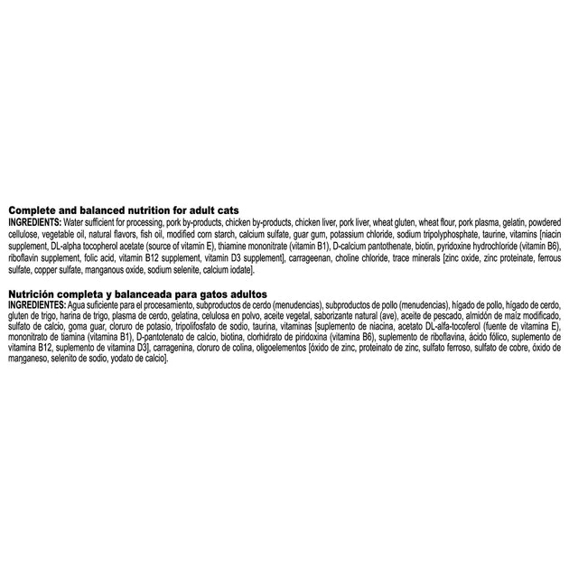 Water Sufficient For Processing, Pork By-Products, Chicken By-Products, Chicken Liver, Pork Liver, Wheat Gluten, Wheat Flour, Pork Plasma, Gelatin, Powdered Cellulose, Vegetable Oil, Natural Flavors, Fish Oil, Modified Corn Starch, Calcium Sulfate, Guar Gum, Potassium Chloride, Sodium Tripolyphosphate, Taurine, Vitamins [Niacin Supplement, Dl-Alpha Tocopherol Acetate (Source Of Vitamin E), Thiamine Mononitrate (Vitamin B1), D-Calcium Pantothenate, Biotin, Pyridoxine Hydrochloride (Vitamin B6), Riboflavin Supplement, Folic Acid, Vitamin B12 Supplement, Vitamin D3 Supplement], Carrageenan, Choline Chloride, Trace Minerals [Zinc Oxide, Zinc Proteinate, Ferrous Sulfate, Copper Sulfate, Manganous Oxide, Sodium Selenite, Calcium Iodate].
