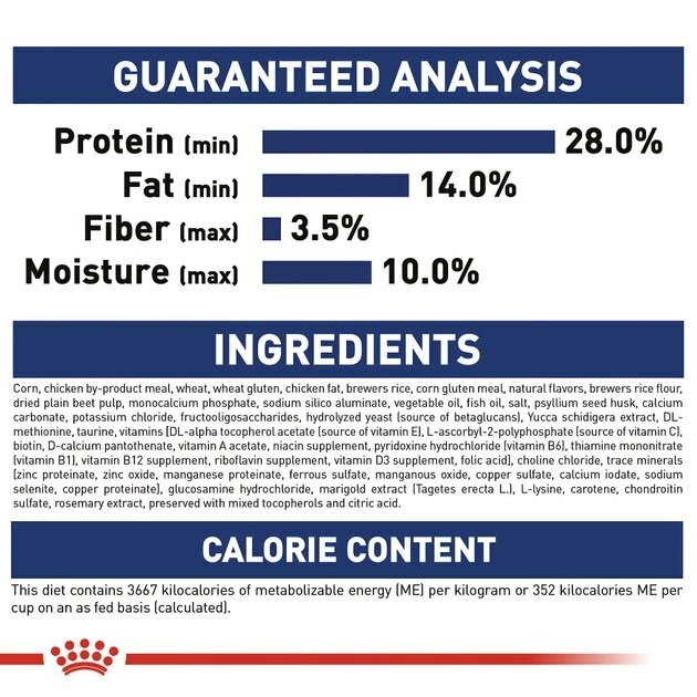 Corn, Chicken By-Product Meal, Wheat, Wheat Gluten, Chicken Fat, Brewers Rice, Corn Gluten Meal, Natural Flavors, Brewers Rice Flour, Dried Plain Beet Pulp, Monocalcium Phosphate, Sodium Silico Aluminate, Vegetable Oil, Fish Oil, Salt, Psyllium Seed Husk, Calcium Carbonate, Potassium Chloride, Fructooligosaccharides, Hydrolyzed Yeast (Source Of Betaglucans), Yucca Schidigera Extract, DL-Methionine, Taurine, Vitamins [DL-Alpha Tocopherol Acetate (Source Of Vitamin E), L-Ascorbyl-2-Polyphosphate (Source Of Vitamin C), Biotin, D-Calcium Pantothenate, Vitamin A Acetate, Niacin Supplement, Pyridoxine Hydrochloride (Vitamin B6), Thiamine Mononitrate (Vitamin B1), Vitamin B12 Supplement, Riboflavin Supplement, Vitamin D3 Supplement, Folic Acid], Choline Chloride, Trace Minerals [Zinc Proteinate, Zinc Oxide, Manganese Proteinate, Ferrous Sulfate, Manganous Oxide, Copper Sulfate, Calcium Iodate, Sodium Selenite, Copper Proteinate], Glucosamine Hydrochloride, Marigold Extract (Tagetes Erecta L.), L-Lysine, Carotene, Chondroitin Sulfate, Rosemary Extract, Preserved With Mixed Tocopherols And Citric Acid.