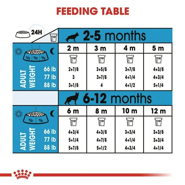 | Adult Target Weight | 2 Months Old Daily Feeding (cup) | 3 Months Old Daily Feeding (cup) | 4 Months Old Daily Feeding (cup) | 5 Months Old Daily Feeding (cup) | 6 Months Old Daily Feeding (cup) | 7 Months Old Daily Feeding (cup) | 8 Months Old Daily Feeding (cup) | 9 Months Old Daily Feeding (cup) | 10 Months Old Daily Feeding (cup) | 11 Months Old Daily Feeding (cup) | 12 Months Old Daily Feeding (cup) | 13 Months Old Daily Feeding (cup) | 14 Months Old Daily Feeding (cup) |