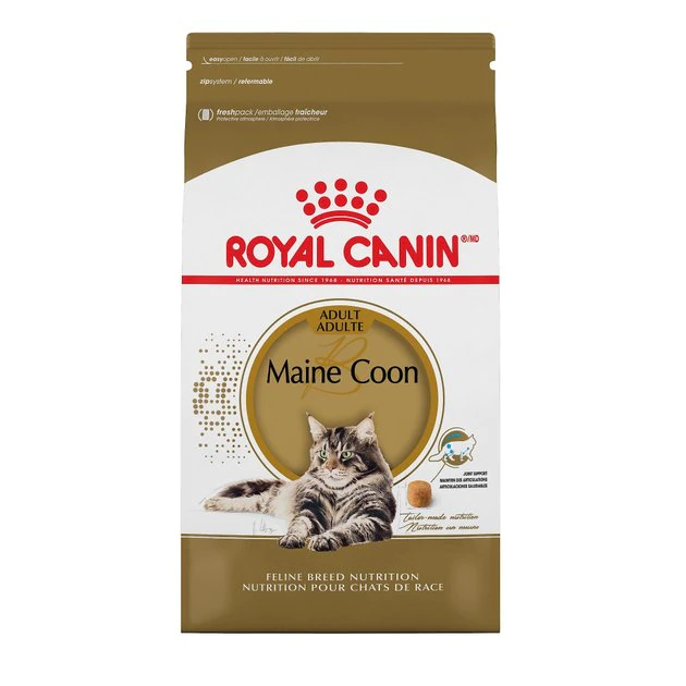 Royal Canin Adult Maine Coon Dry Cat Food is a breed-specific diet created just for your Maine Coon pure breed. This exclusive dry formula contains heart-healthy nutrients like taurine, EPA and DHA to promote good cardiac health, and breed-specific nutrients to promote healthy skin and a healthy coat, keeping his shaggy coat shiny and soft. Omega-3 and omega-6 fatty acids support healthy bones and joints that can be strained by the Maine Coon catβs large stature. And the cube-shaped specialized kibble is designed for your large breed catβs square jaw, so he can slow ingestion, chew thoroughly, and crunch away tartar buildup. Mix in or complement this dry food with Royal Canin Maine Coon Thin Slices in Gravy Wet Cat Food for a meal thatβs sure to please.