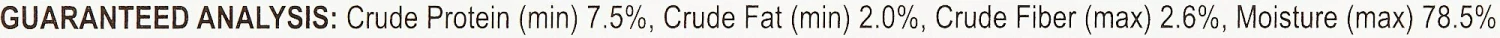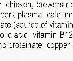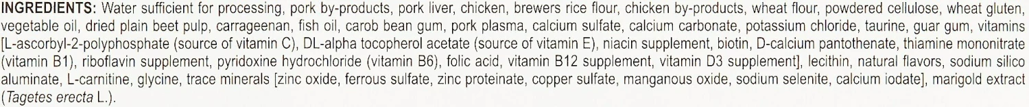 Water sufficient for processing, pork by-products, pork liver, chicken, brewers rice flour, chicken by-products, wheat flour, powdered cellulose, wheat gluten, vegetable oil, dried plain beet pulp, carrageenan, fish oil, carob bean gum, pork plasma, calcium sulfate, calcium carbonate, potassium chloride, taurine, guar gum, vitamins [L-ascorbyl-2-polyphosphate (source of vitamin C), DL-alpha tocopherol acetate (source of vitamin E), niacin supplement, biotin, D-calcium pantothenate, thiamine mononitrate (vitamin B1), riboflavin supplement, pyridoxine hydrochloride (vitamin B6), folic acid, vitamin B12 supplement, vitamin D3 supplement], lecithin, natural flavors, sodium silico aluminate, L-carnitine, glycine, trace minerals [zinc oxide, ferrous sulfate, zinc proteinate, copper sulfate, manganous oxide, sodium selenite, calcium iodate], marigold extract (Tagetes erecta L.)