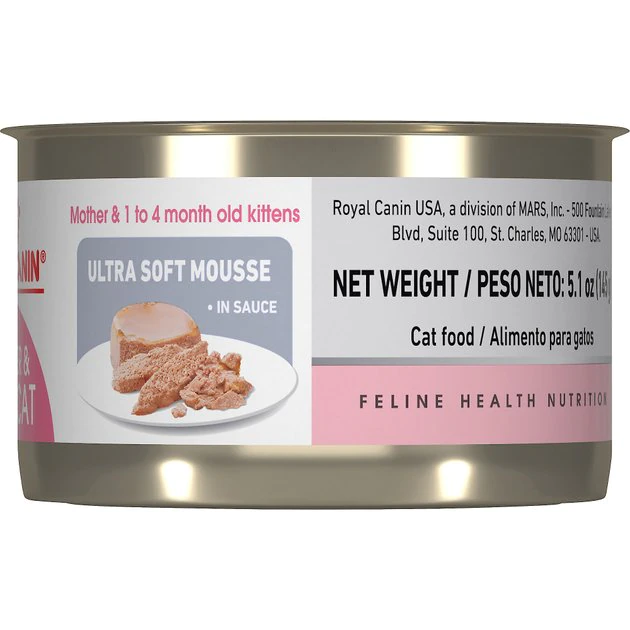 Royal Canin Mother & Babycat Wet Cat Food feeds your young kitten’s magnificence from the very start with the building blocks needed for healthy growth and development. Essential nutrients like DHA build a strong foundation for healthy brain development. Antioxidants and vitamins help strengthen immune support. Highly digestible proteins and prebiotics promote healthy digestion. And with its ultra-soft mousse texture made for tiny mouths, you can easily transition your newborn kitten to a more “grown-up” diet of solids.